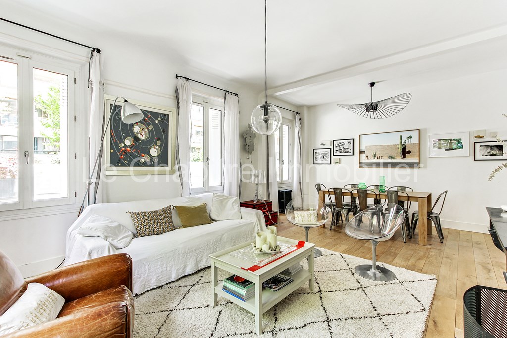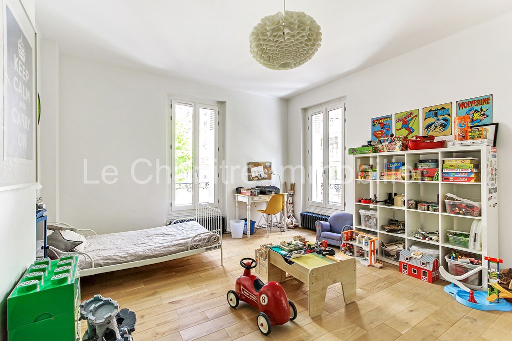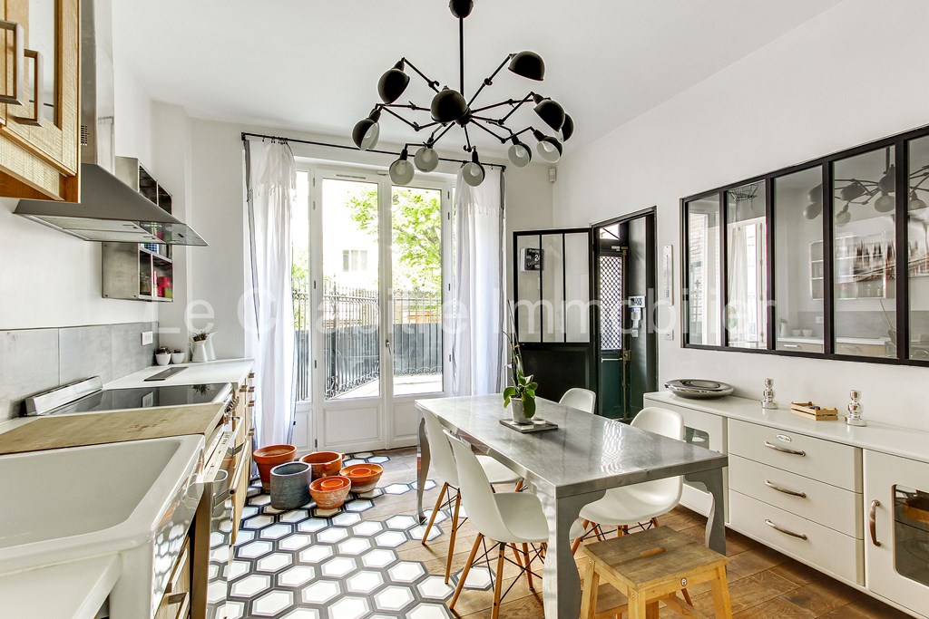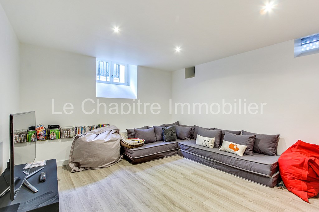 Entièrement refaite par architecte, cette maison d’environ 210m2 a été conçue pour satisfaire aux besoins d'une famille. Elle se compose au rez-de-chaussée d'une entrée donnant accès à la cuisine dînatoire, elle-même complétée par une buanderie. Au même niveau, on trouve le séjour-salle à manger et un cabinet de toilette. Au premier étage, deux chambres avec salle de bain attenante et des surfaces de rangement, et un deuxième cabinet de toilette. Au deuxième étage une majestueuse master-bedroom, avec 5m de hauteur sous plafond avec une salle de douche et un dressing, et une quatrième chambre avec sa propre salle de douche. À l entresol une salle de cinéma/jeux et une cave à vin. L accès à la maison se fait par la cour pavée.